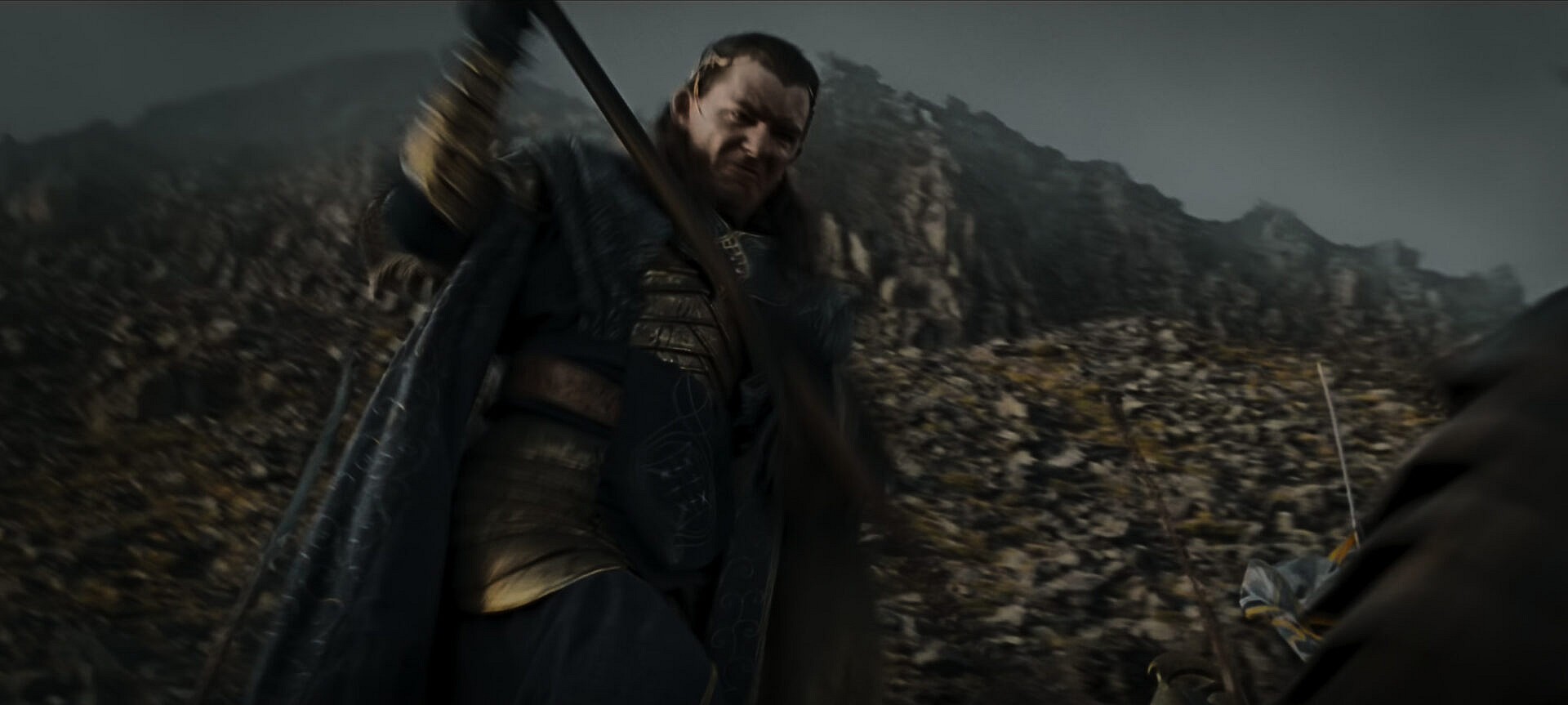 Although the character’s death scene was cut from the film, he can still be seen for a few brief moments slaying an orc with Aeglos, the king’s famed spear from Tolkien’s lore.