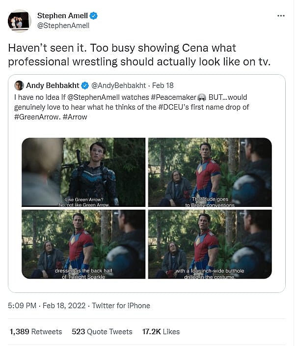 “Haven’t seen it,” Amell said of Peacemaker and its finale. “Too busy showing Cena what professional wrestling should actually look like on tv.”
