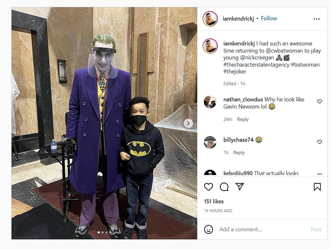 Jackson wrote on Instagram, “I had such an awesome time turning to Batwoman to play young Nick Creegan.” He then shared the photo of him standing next to an unnamed actor as the Joker.