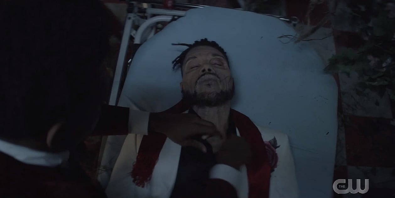 In the eighth episode, Creegan doesn’t don any white face point, instead Batwoman injects him with a serum that appears to petrify him.