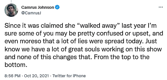 “Since it was claimed she ‘walked away’ last year I’m sure some of you may be pretty confused or upset, and even moreso that a lot of lies were spread today,” he continued. “Just know we have a lot of great souls working on this show and none of this changes that. From the top to the bottom.”