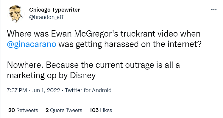 In response Fiadino, the creator of Chicago Typewriter, wrote on Twitter, “Where was Ewan McGregor’s truckrant video when Gina Carano was getting harassed on the internet? Nowhere. Because the current outrage is all a marketing op by Disney.”