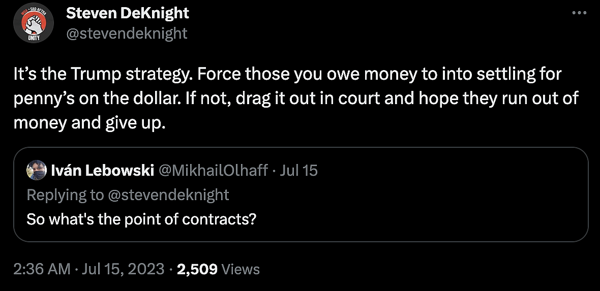 In a follow-up tweet, responding to a Twitter user who asked what the point of contracts was, DeKnight did not waste an opportunity to smear former President Donald Trump, declaring, “It’s the Trump strategy. Force those you owe money to into settling for penny’s on the dollar.”