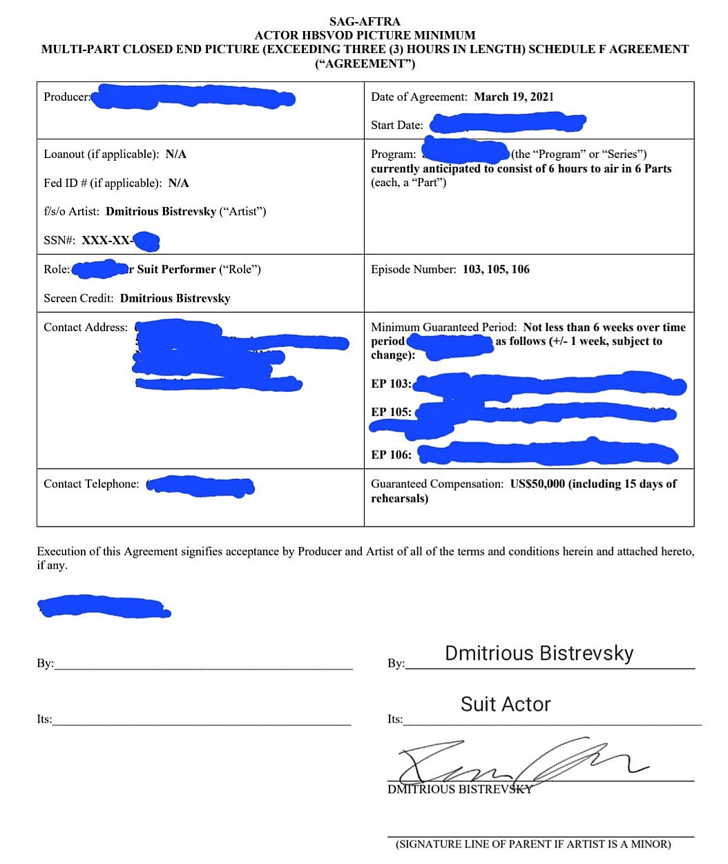 Ultimately, Bistrevsky ended his series of accusatory reveals by three images, beginning with a redacted image of his supposed contract, which confirms that including his return for the last two episodes of the season, he was set to receive a “Guaranteed Compensation” of $50,000 USD: