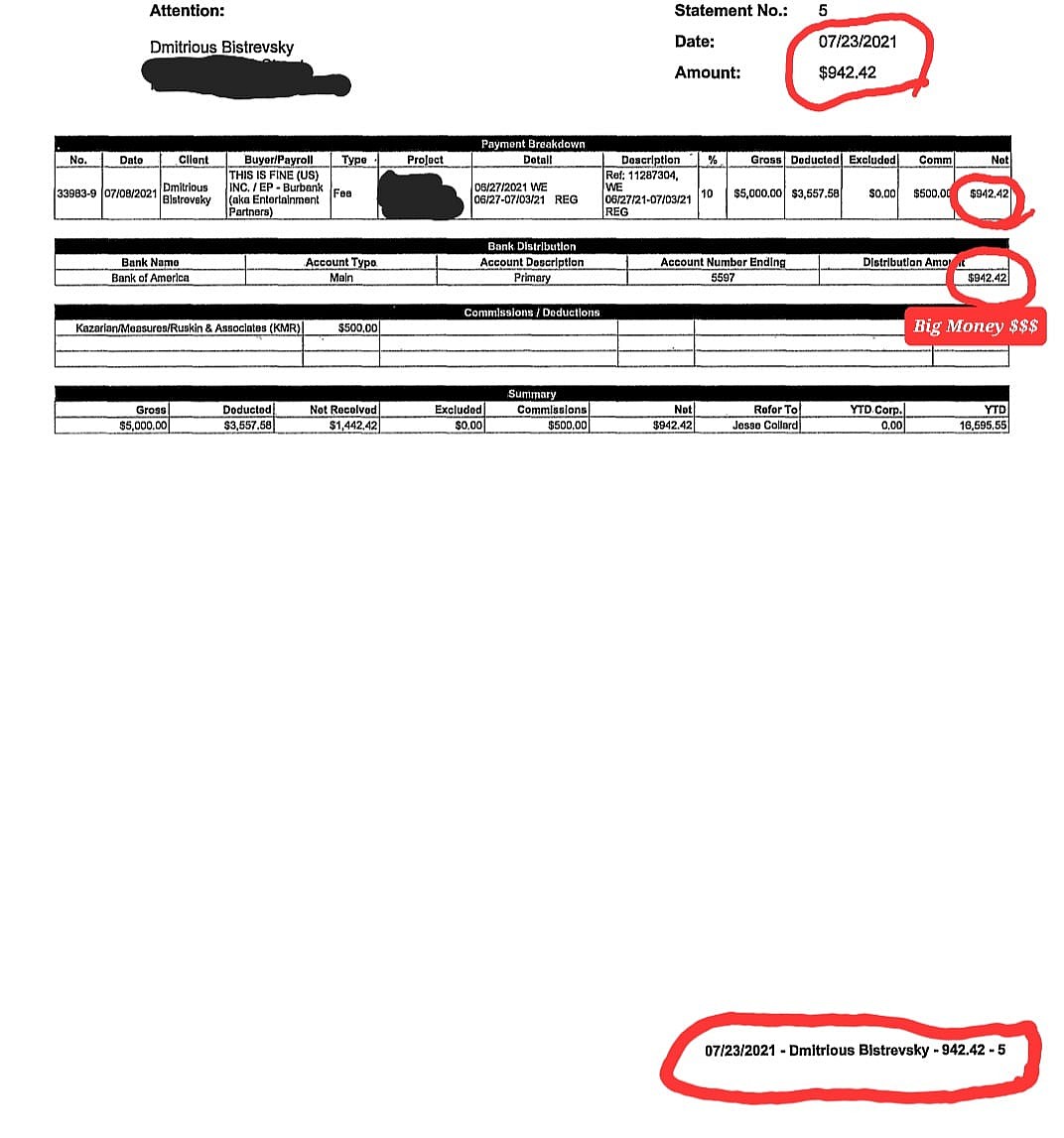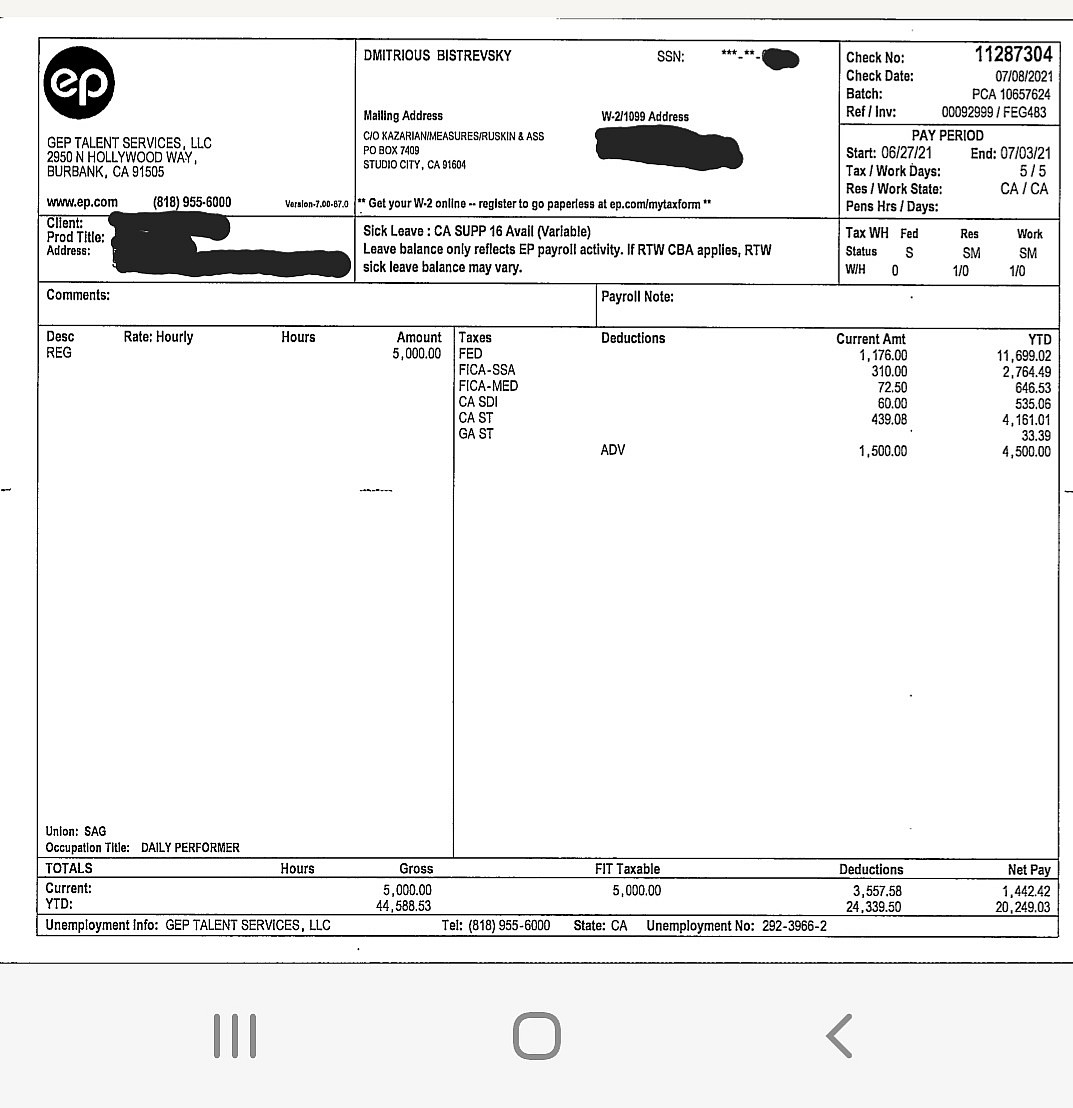 And finally another statement showing that with an additional $500 USD deduction for his managing talent agency, Kazarian/Measures/Ruskin & Associates Inc., the actor took home just $942.42 USD for the week’s physically demanding work.