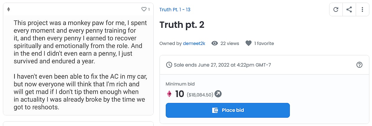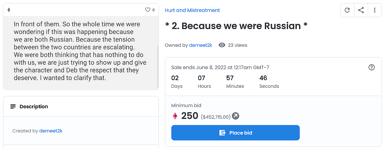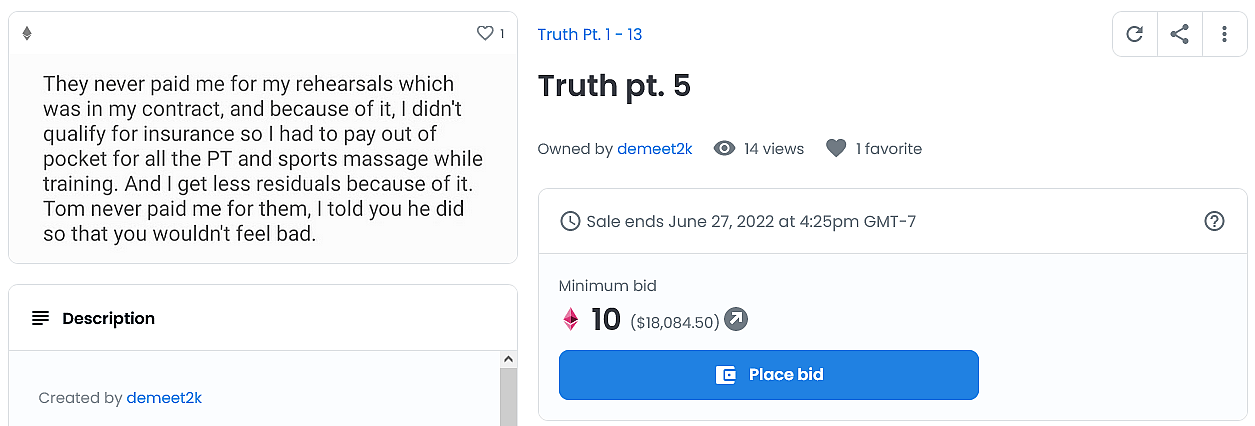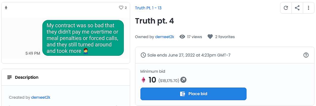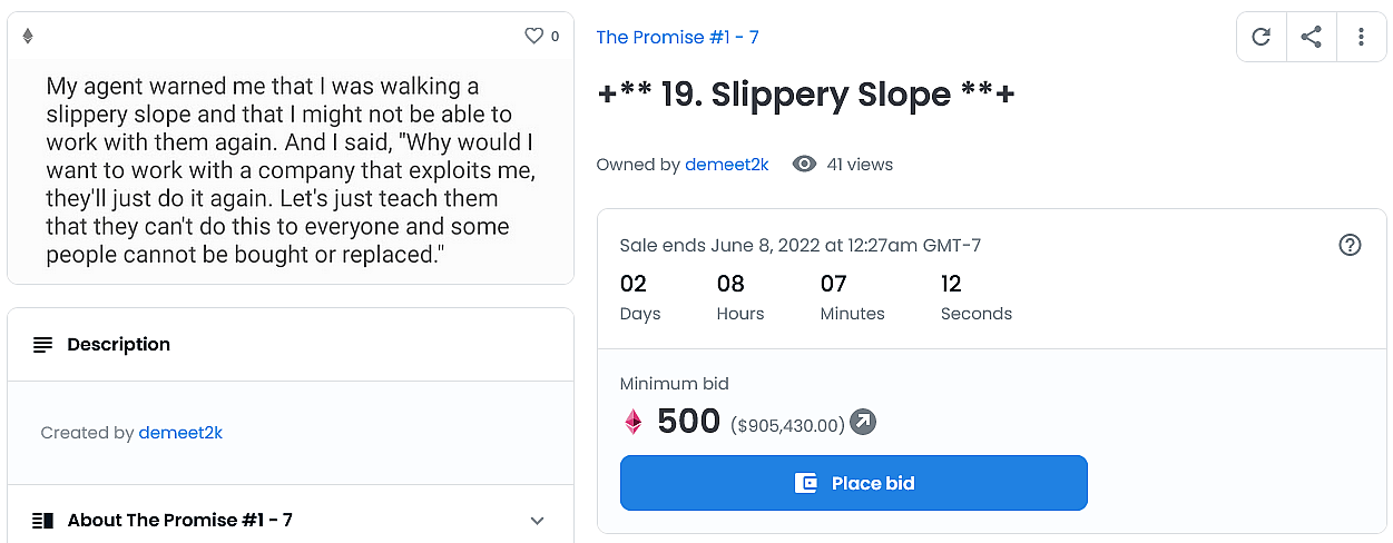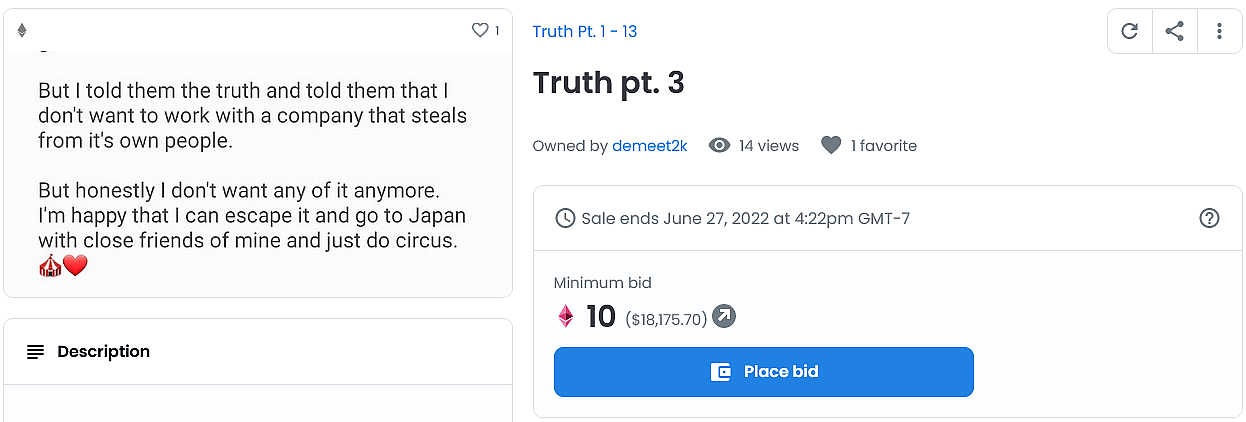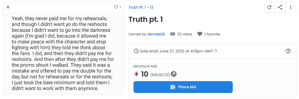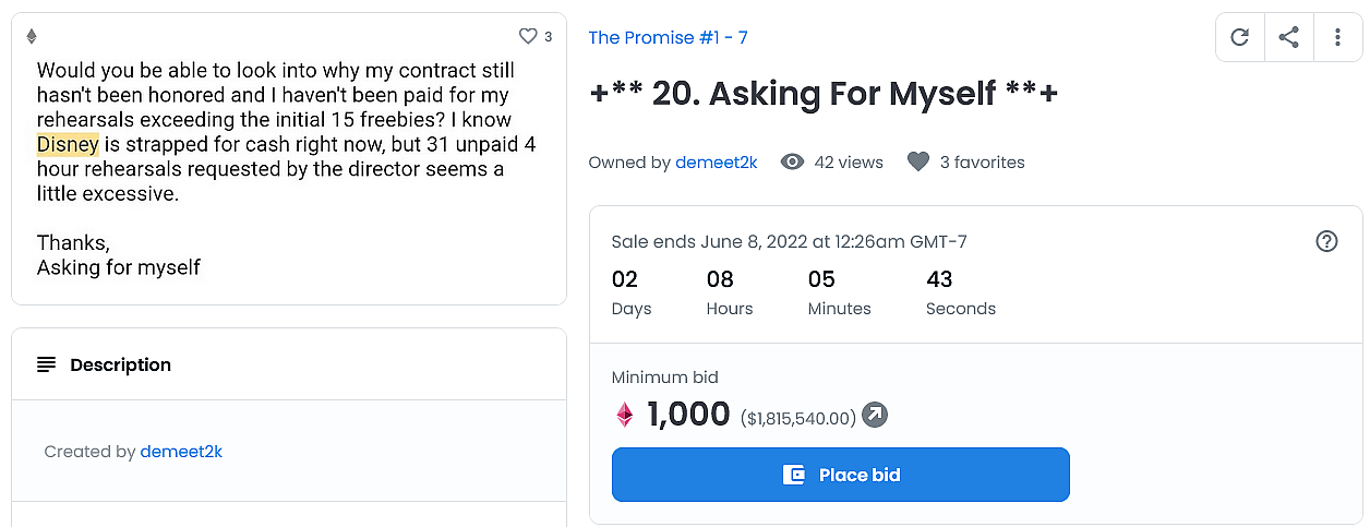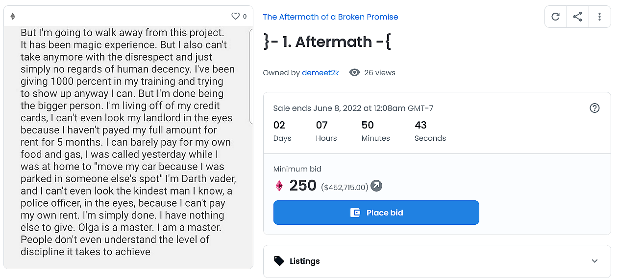 The Ukranian born Bistrevsky leveled his accusations against the entertainment conglomerate on May 28th, unconventionally releasing a series of statements – each of which appear to have either been written in his mobile phone’s notes app or sent in conversation to an unknown individual – by minting them as NFTs and offering them up for auction on popular NFT marketplace OpenSea.