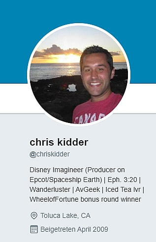 First reported by WDW Pro at Pirates and Princesses, Kidder described himself in his Twitter bio as a Disney Imagineer and producer on Epcot/Spaceship Earth.