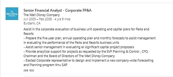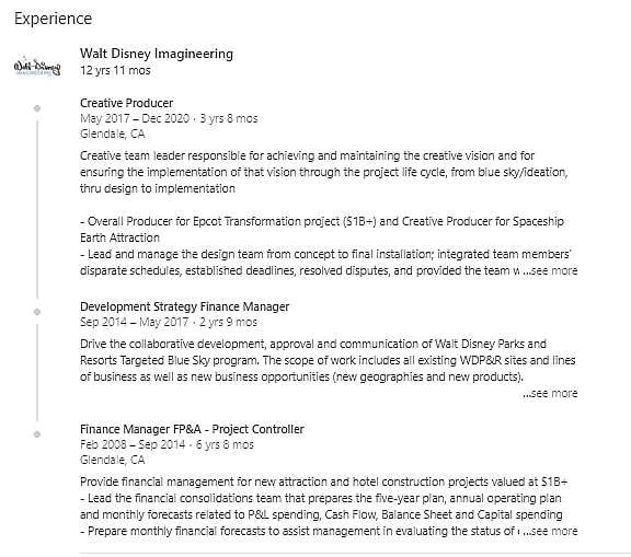 Before he began working with Walt Disney Imagineering his profile says he worked for almost 5 years as a Senior Financial Analyst for The Walt Disney Company.