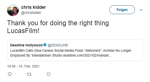 As for his praising of Disney and Lucasfilm firing Carano, he posted to Twitter back on February 10th after it was announced that Carano had been fired.