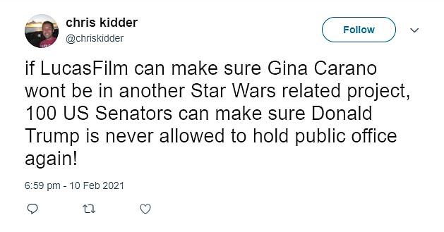 In a subsequent tweet, he then added, “if LucasFilm can make sure Gina Carano won’t be in another Star Wars related project, 100 US Senators can make sure Donald Trump is never allowed to hold public office again!”