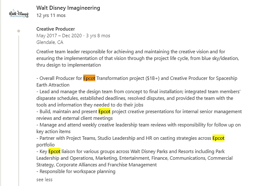 He also adds, “Overall Producer for Epcot Transformation project ($1B+) and Creative Producer for Spaceship Earth Attraction.”