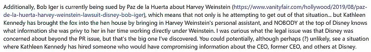 “Additionally, Bob Iger is currently being sued by Paz de la Huerta about Harvey Weinstein (https://www.vanityfair.com/hollywood/2019/08/paz-de-la-huerta-harvey-weinstein-lawsuit-disney-bob-iger), which means that not only is he attempting to get out of that situation… but Kathleen Kennedy has brought the fox into the hen house by bringing in Harvey Weinstein’s personal assistant, and NOBODY at the top of Disney knows what information she was privy to her in her time working directly under Weinstein. I was curious what the legal issue was that Disney was concerned about beyond the PR issue, but that’s the big one I’ve discovered. You could potentially, although perhaps (?) unlikely, see a situation where Kathleen Kennedy has hired someone who would have compromising information about the CEO, former CEO, and others at Disney.”