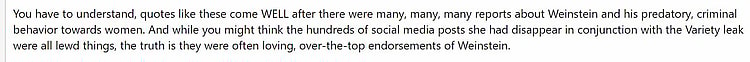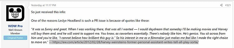 WDW Pro adds, “You have to understand, quotes like these come WELL after there were many, many, many reports about Weinstein and his predatory, criminal behavior towards women. And while you might think the hundreds of social media posts she had disappear in conjunction with the Variety leak were all lewd things, the truth is they were often loving, over-the-top endorsements of Weinstein.”