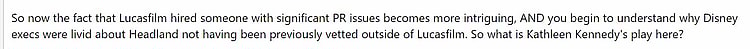 He concludes, “So now the fact that Lucasfilm hired someone with significant PR issues becomes more intriguing, AND you begin to understand why Disney execs were livid about Headland not having been previously vetted outside of Lucasfilm. So what is Kathleen Kennedy’s play here?”