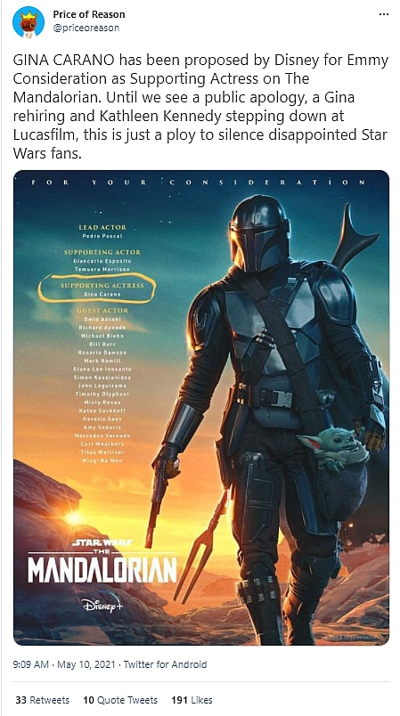 He wrote, “GINA CARANO has been proposed by Disney for Emmy Consideration as Supporting Actress on The Mandalorian. Until we see a public apology, a Gina rehiring and Kathleen Kennedy stepping down at Lucasfilm, this is just a plot to silence disappointed Star Wars fans.”