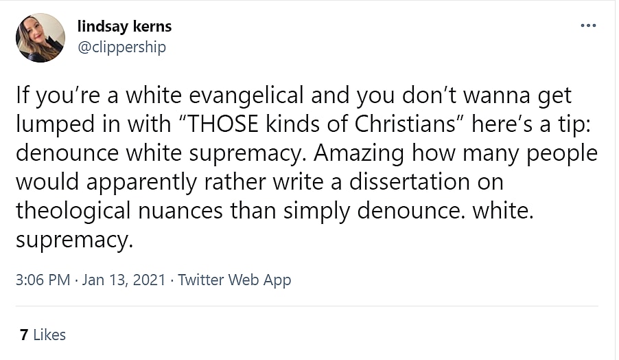 More recently in January, she wrote, “If you’re a white evangelical and you don’t wanna get lumped in with ‘THOSE kinds of Christians’ here’s a tip: denounce white supremacy. Amazing how many people would apparently rather write a dissertation on theological nuances than simply denounce. white. supremacy.”