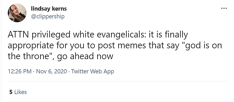 In November 2020, following the election of Joe Biden, she wrote, “ATTN privileged white evangelicals: it is finally appropriate for you to post memes that say ‘god is on the throne’, go ahead now.”