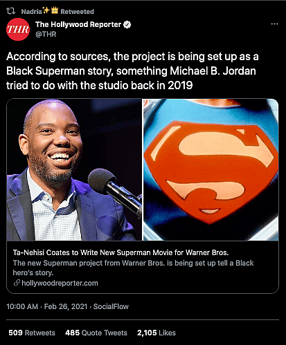 Additionally, Tucker has reteweeted the announcement of WB/DC’s move to produce a J.J. Abrams and Ta-Nehisi Coates Superman reboot.