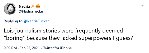 She then complains that story lines surrounding Lois’ journalism “were frequently deemed ‘boring'” – most likely because the current atmosphere of the fourth estate is about clicks and controversies rather than doing real investigative work, asking tough questions, and holding other institutes of power and influence accountable – and speculates that it was “because they lacked superpowers.”