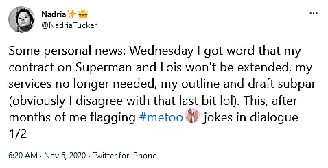 Last November, a number of entertainment news outlets reported that writer Nadria Tucker had been let go from the Superman & Lois writers room during the production of the show’s first season.
