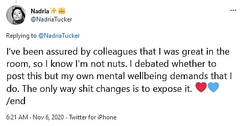 Tucker further asserted that colleagues had assured her that she “was great in the [writer’s] room, so I know I’m not nuts” and also “debated whether to post this but my own mental wellbeing demands that I do. The only way sh*t changes is to expose it. /end.”