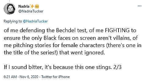 Though it’s possible that she was let go because she wasn’t that great at writing, that possibility is not an idea that Tucker herself is apparently willing to entertain, as she defended her role in the writer’s room by asserting that she was simply “defending the Bechdel test,” “FIGHTING to ensure the only Black faces on screen aren’t villains”, and “pitching stories for female characters (there’s one in the title of the series!) that went ignored.”