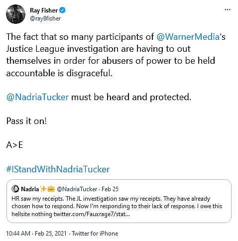 Suddenly, taking notice of her mention of the independent Justice League investigation launched in response to actor Ray Fisher’s claims of abuse by Warner Bros. executives during the film’s reshoots, Fisher himself retweeted Tucker’s above declaration and stated “The fact that so many participants of @WarnerMedia’s Justice League investigation are having to out themselves in order for abusers of power to be held accountable is disgraceful.”