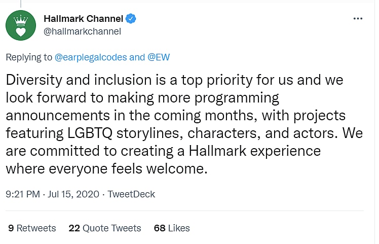 This sentiment would be echoed by the company’s official Twitter account that wrote, “Diversity and inclusion is a top priority for us and we look forward to making more programming announcement in the coming months, with projects featuring LGBTQ storylines, characters, and actors. We are committed to creating a Hallmark experience where everyone feels welcome.”