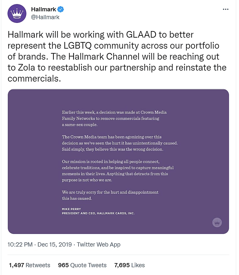 RELATED: Boycott of Hallmark Channel Started After Company Reversed Decision on Zola’s Same-Sex Wedding Commercials