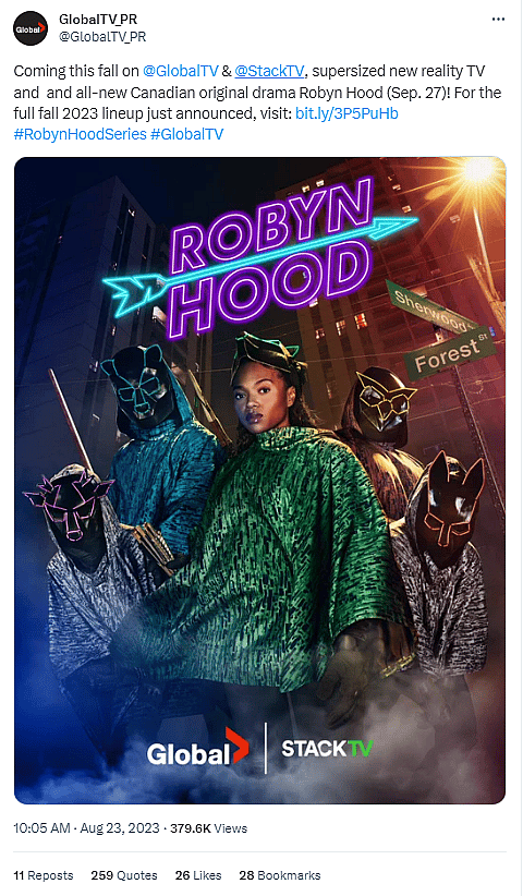 The company’s publicity account would share a poster for the series to X as well writing, “Coming this fall on Global TV & Stack TV, supersized new reality TV and all-new Canadian original drama Robyn Hood (Sep. 27)!”