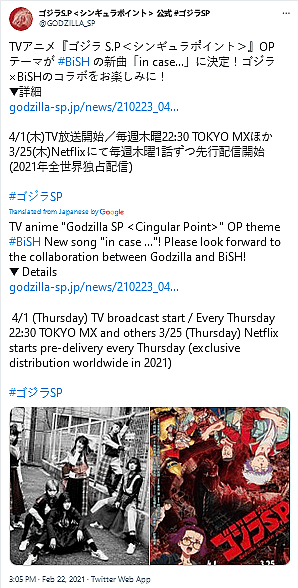 The Godzilla Singular Point Twitter account then shared the news that the series’ opening theme song would be an ‘In case…’, a new and original song from Japanese idol group BiSH (otherwise known as Brand-new idol S–T).