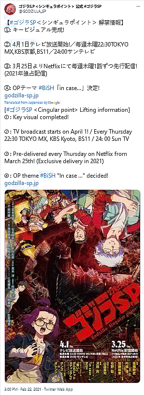 Alongside the key visual, the Twitter post also contains some news about when Godzilla Singular Point will air in Japan, noting that the series is set to premiere on Netflix Japan on March 25th and will be broadcast “every Thursday” across TOKYO MX, KBS Kyoto, BS11, and Sun T beginning on April 1st.