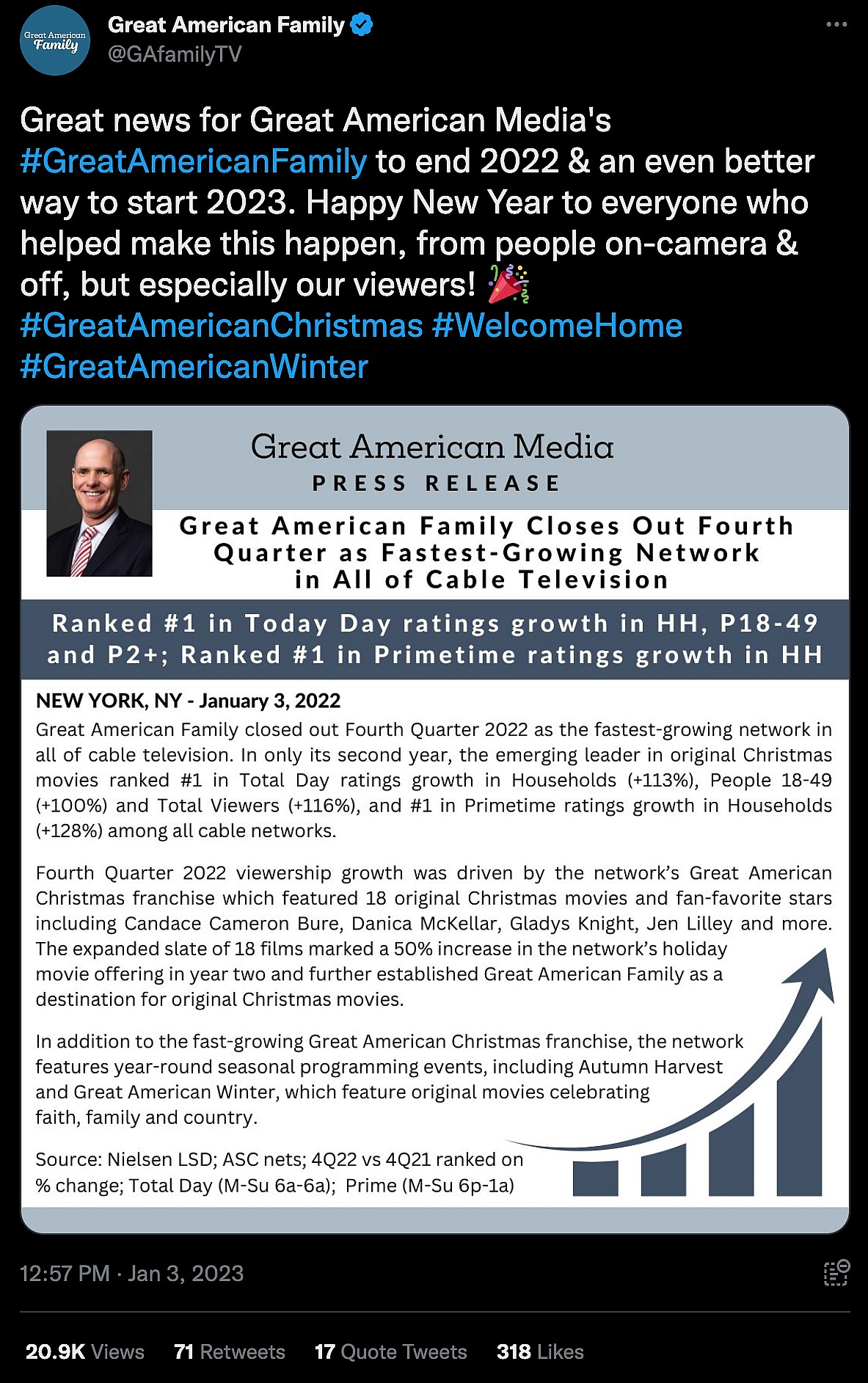 The post included a screenshot of Great American Family’s press release, wherein the network’s CEO, Bill Abbott,  shared the news as the company closed out Fourth Quarter 2022 as the fastest-growing network in all of cable television.
