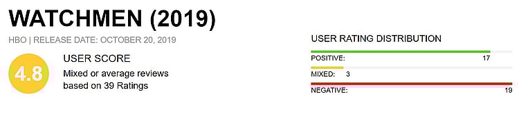 Prettyboyfloyd gives the show a 0. They write, “Not Alan Moore’s Watchmen, but Lindehoff’s attempt off making Black Panther. And there’s only one reason he needs to inject his idea’s into some one else’s franchise, because he’s too much of a hack to create his own.”