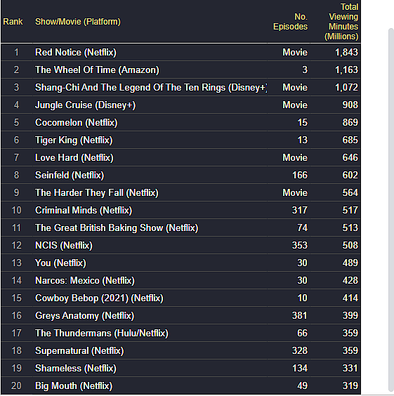Wheel of Time was the number two most streamed program behind Netflix’s Red Notice film for the week ending November 21, 2021.