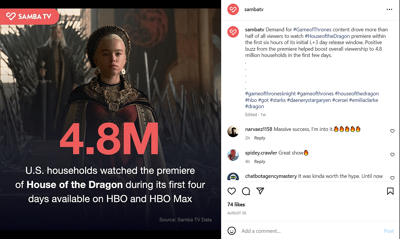 Third party data tracker Samba TV claimed the House of the Dragon premiere was viewed by 2.6 million US households in its first six hours on both traditional linear TV and streaming.