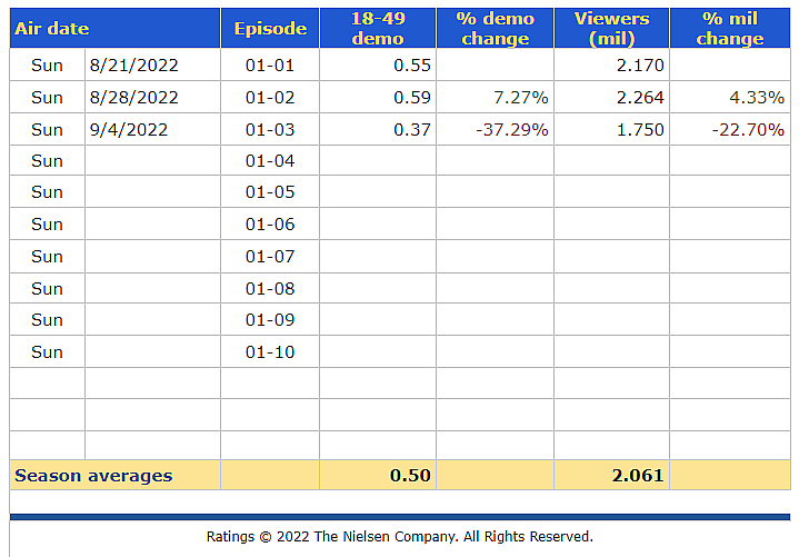 The third episode’s viewership came in at 1.75 million. That’s down from 2.264 million from episode 2 and 2.170 million from the series premiere.
