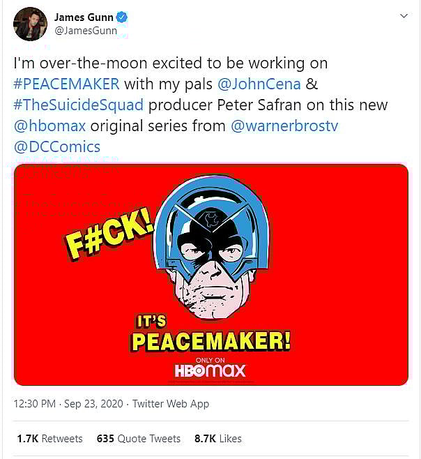 Gunn made the announcement on Twitter writing, “I’m over-the-moon excited to be working on Peacemaker with my pals John Cena and The Suicide Squad producer Peter Safran on this new HBO Max original series from Warner Bros. TV and DC Comics.”