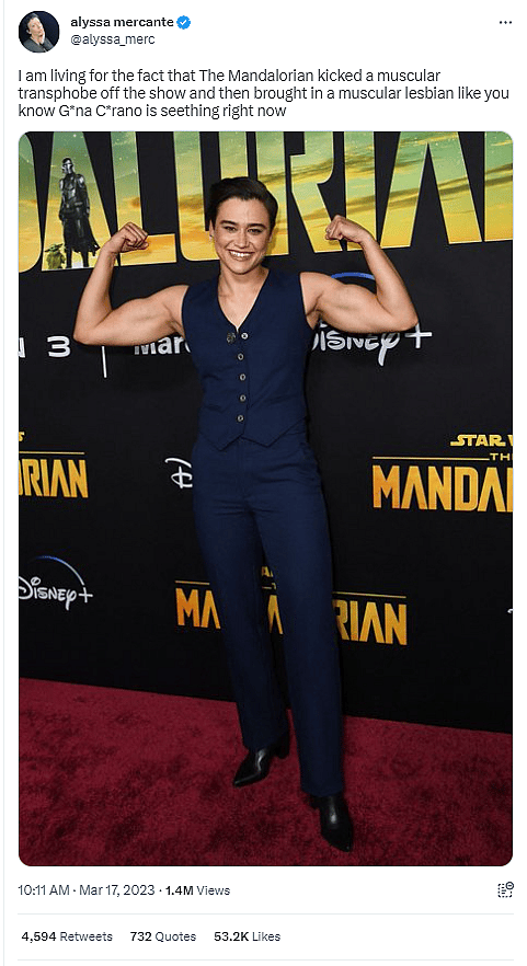 Mercante posted to Twitter writing, “I am living for the fact that The Mandalorian kicked a muscular transphobe off the show and then brought in a muscular lesbian like you know G*na C*rano is seething right now.”