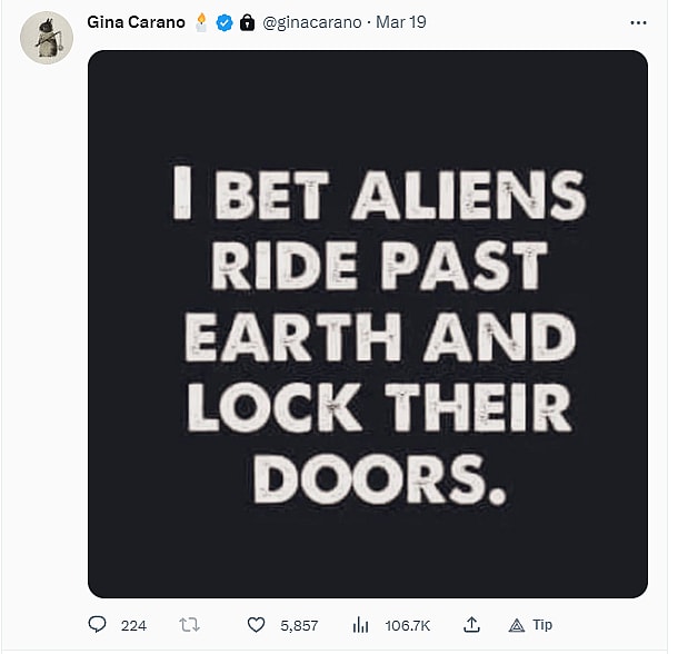 Carano did post a meme on March 19th ridiculing all the craziness happening here on earth. It reads, “I bet aliens ride past earth and lock their doors.”