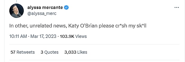 Mercante followed that up writing, “In other, unrelated news, Katy O’Brian please cr*sh my sk*ll”
