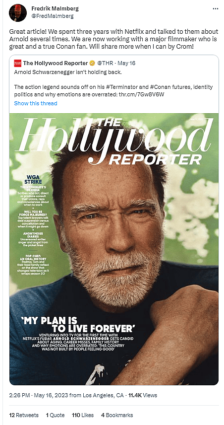 Reacting to Schwarzenegger’s comments, Heroic Signatures President Fredrik Malmberg wrote on Twitter, “Great article! We spent three years with Netflix and talked to them about Arnold several times. We are now working with a major filmmaker who is great and a true Conan fan. Will share more when I can by Crom!”