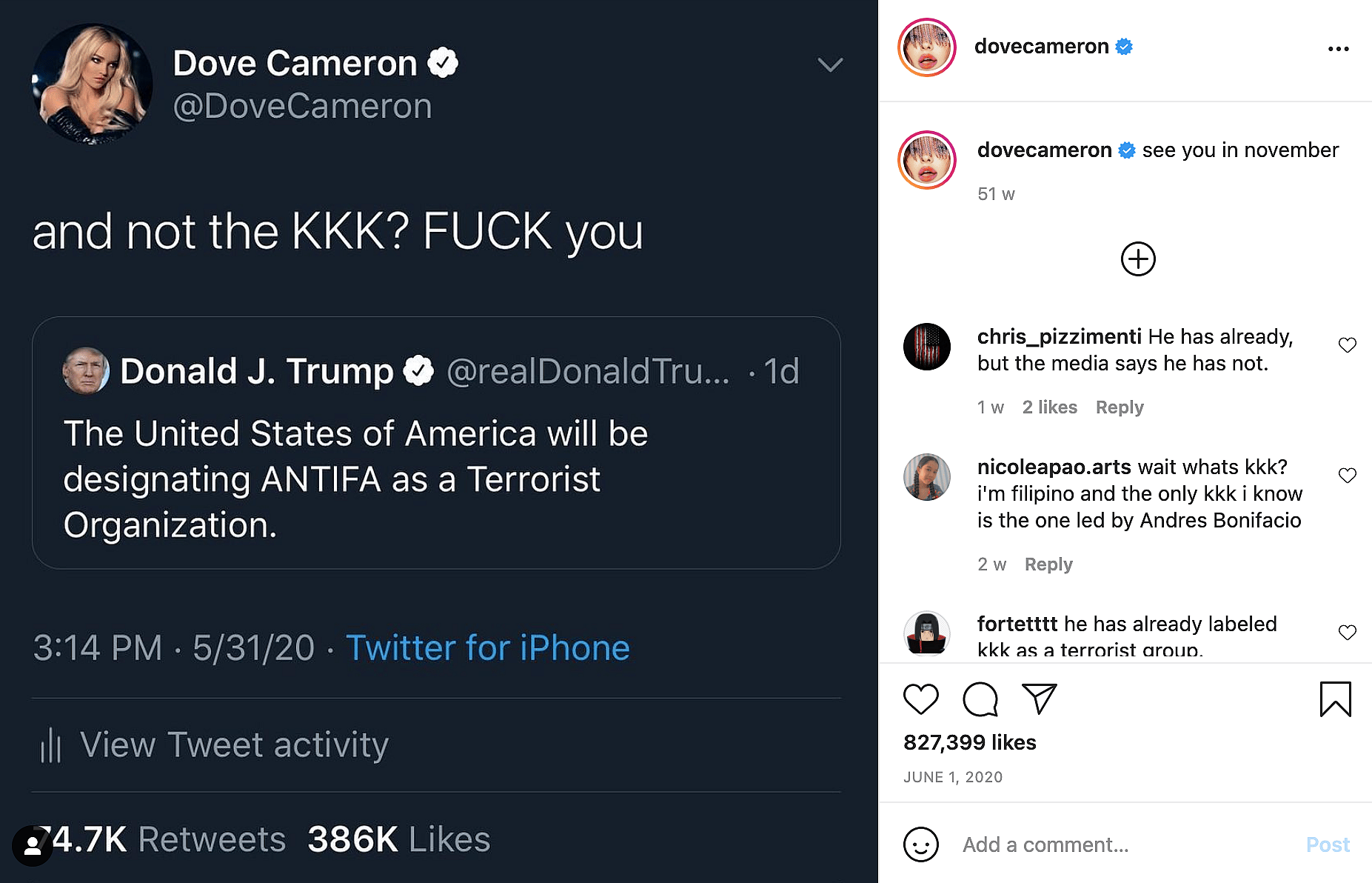 Whether Cameron truly supports every aspect of Antifa or not is up for debate, but what isn’t is the fast that President Donald Trump did condemn the KKK and white supremacists in the past.