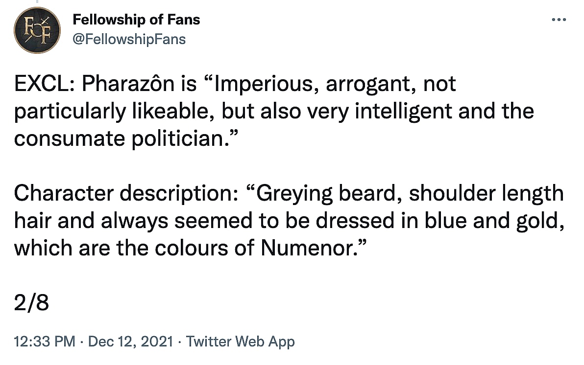 “Pharazôn is ‘Imperious, arrogant, not particularly likeable, but also very intelligent and the consumate politician,'” Fellowship of Fans tweeted.