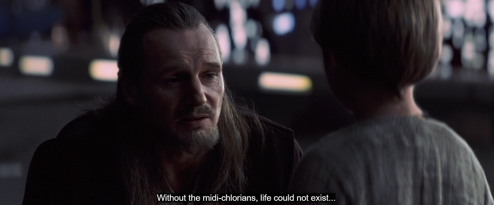 He added, “Life forms living together for mutual advantage. Without the Midi-chlorians life could not exist and we would have no knowledge of the Force. They continually speak to us, telling us the will of the Force. When you learn to quiet your mind, you’ll hear them speaking to you.”