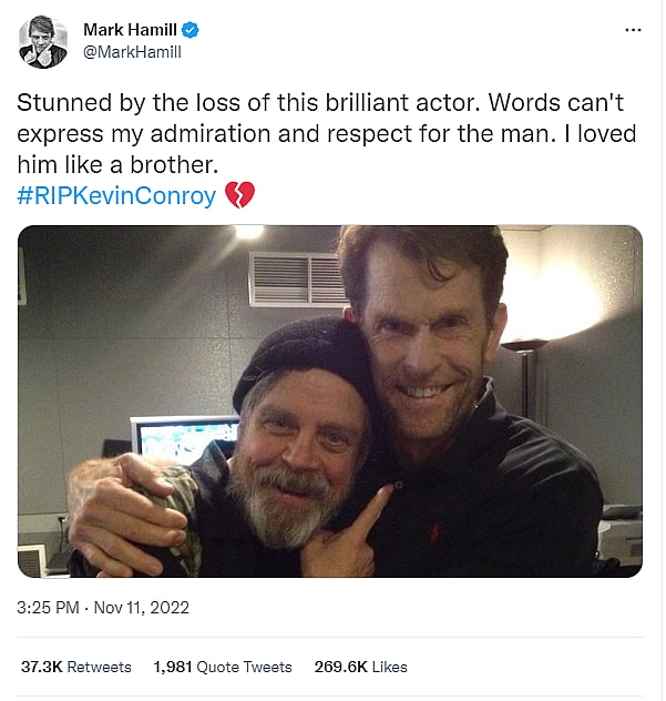 A day after Conroy passed from cancer at age 66, Hamill paid tribute to the man, tweeting, “Stunned by the loss of this brilliant actor. Words can’t express my admiration and respect for the man. I loved him like a brother.” His post was tagged with #RIPKevinConroy and a broken heart emoji – a sentiment shared across social media in memory of the actor.