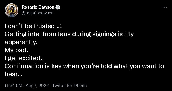 “I can’t be trusted…!” Dawson tweeted hours after her in-person appearance. “Getting intel from fans during signings is iffy apparently. My bad.”