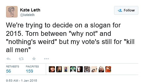 Likewise, on January 1st, 2015, Leth wrote – seemingly apropos of nothing but her general disdain for men – “We’re trying to decide on a slogan for 2015. Torn between ‘why not’ and ‘nothing’s weird’ but my vote’s still for ‘kill all men.’”