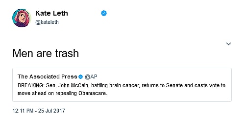 Another such example of her anti-male rhetoric occurred in 2017, when in response to the late Senator John McCain’s return to the US Senate amidst his battle with brain cancer to vote in favor of further discussions regarding the repealing of ‘Obamacare,’ Leth declared, “Men are trash.”