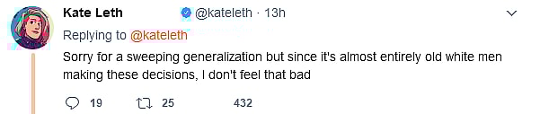 “Sorry for a sweeping generalization but since it’s almost entirely old white men making these decisions,” she added. “I don’t feel bad.”